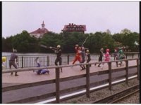 Zoom out, as the five Rangers, now wielding their Zeo Power Weapons, combat the Cogs on the waterfront walkway. |