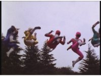 As a team, all five Rangers flip over, high in the air, in perfect formation and timing. |