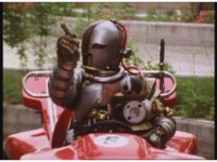 Still in his go-cart, Klank catches Orbus, then points forth while driving on. |