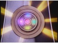 Close-up on Zeonizer, the golden disc thing pops up, releasing a shimmering green light. |