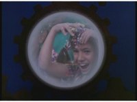Standing behind King Mondo, who soon turns around to look, Queen Machina begins to talk, stepping over to our left. Slow zoom on her talking, turning around in front of Earth cut-out as she gestures fan. |