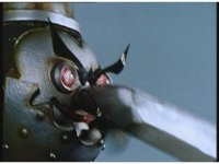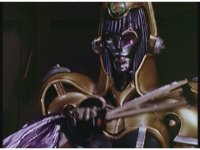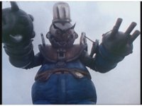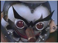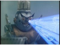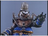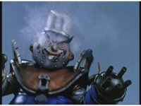 Close-up on Puppet Blaster, as the Megazord Saber sparkily chops off his prominent nose. |