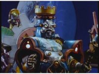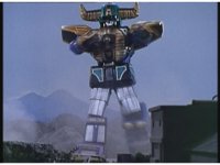Zoom in over Zeo Megazord with Zeo Four Helmet's shoulder to Puppet Blaster, nervous. |