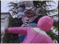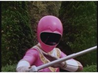 Kat calls for Zeo Ranger 1, Pink, as said color energy flashes about, a green grid overlaying on her body. Briefly, we cut to an outstretched arm morphing into a gloved Zeo Ranger hand. Cut back to Kat, as the rising energy covers her completely, becoming the Pink Zeo Ranger, visor and costume circuits shimmering with power. |