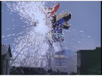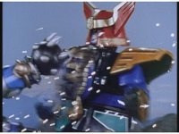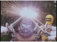 Close on Puppet Blaster getting sparkily punched by Zeo Megazord. |