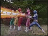 Facing our left and stepping forth, the five Rangers fire golden beams from their Pistols all at once. |