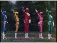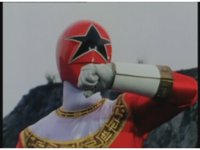 Red beam materializes into Red Ranger, his teammates regrouping around, then do a group salute pose. |