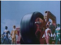 Zoom out, as Red Ranger stands inside the Defender Wheel, facing our left, readied. |