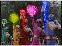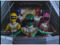 Close on Red Zeo Ranger nod-talking, zoom out to reveal he's in the front seat of the crowded Zeo Megazord cockpit, his four teammates behind him all motioning their right hands up into the air at once. |