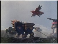 Close on Zeozords Three & Four, finishing their connection in the middle of the sky, releasing steam upon linking up. |