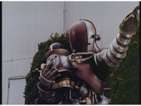 Track left around the front of Zeozord Three, as Zeozord Five shifts around behind it, revealing the Megazord head, connecting with steam releasing. |