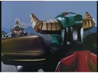 Close-up on Zeo Megazord's head as the Zeozord Five Battle Helmet slides down over it, flashing happening just off-frame. |