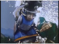 Rocky calls for Zeo Ranger 3, Blue, as said color energy flashes about, a green grid overlaying on his body. The rising energy covers him completely, becoming the Blue Zeo Ranger, visor and costume circuits shimmering with power. |