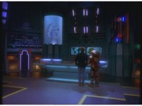 Zordon in his Power Chamber plasma tube talks to Billy & Alpha on our right. |