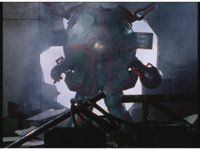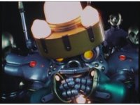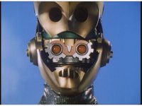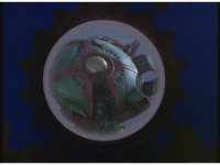 Close-up on Cog's face as its eye region slides up, exposing clockwork eyes. Cut to extreme close-up of its eyes as they flash with energy being released. |