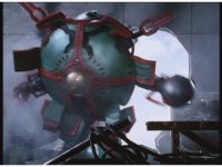 Far exterior of the Machine Empire Skybase against the profile of the Earth. Quadrafighters walking to our right, others flying to our left in the distance, Gearships hovering about, and a group of Cogs walking on some scaffolding. |