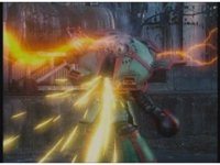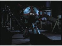 Lasers and sparks flash as a part of a wall vanishes, Hydro-Contaminator de-cloaking as he materializes and faces our left. |
