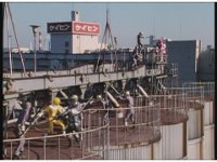 Zoom out as the Rangers fight multiple Cogs a piece on the rooftop of the industrial structure. |
