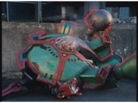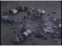 Zoom out from Cog, lying in smoking pieces, which spark burst. |