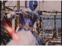 Against black back-drop, Red, with his teammates holding on him in twos behind, holds Zeo Blaster forth, Ranger-colored energy crackling and flashing, before releasing a golden sphere of energy to our slight left. |