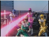 Blue, Green, Pink & Yellow Rangers fire their Zeo Laser Pistols to our slight left. |