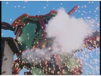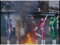 An explosion erupts massively, and through the smoke, the five Rangers rush in. Red holds the Zeo Blaster upward, as his teammates do a salute pose. |