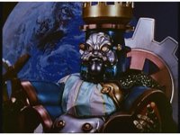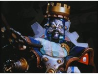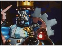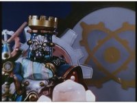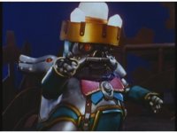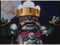 Slow zoom in from across the Skybase, as King Mondo turns around, heads to the center of the room, talking while some motioning of his hand and staff, eventually turning to our right. During this, Queen Machina turns away from her husband, fretting. Prince Sprocket covers his eyes and keeps away. Klank squats down and keeps low, covering his head, while Orbus remains attached to him. |