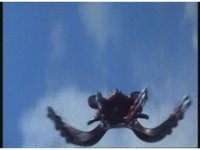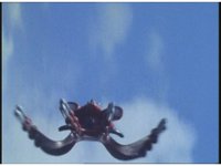 Close on Quadrafighter, flying to our right, two middle bent-legs glowing and then releasing energy-ring beam. |