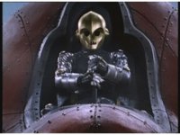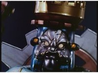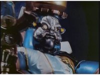 Beside the viewscreen, King Mondo talks, motioning hand and staff. Then slow zoom in on King Mondo's face, still talking, rising up and down and motioning arm and staff out of frame while doing so. |