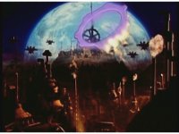 Far exterior of the Machine Empire Skybase against the profile of the Earth. In the distance, Gearships hovering about, exhaust pipes spewing balls of fire into the atmosphere. Suddenly, a purple energy cog-shape fires off from the structure. |