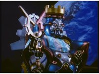 Sharp zoom in on King Mondo turning completely around from Earth cut-out, shouting and raising arm and wand out of frame. |