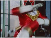 Tommy calls for Zeo Ranger 5, Red, as said color energy flashes about, a green grid overlaying on his body. The rising energy covers him completely, becoming the Red Zeo Ranger, visor and costume circuits shimmering with power. |