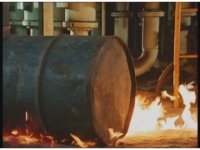 Mechanizer lifts up an oil drum and smacks Blue & Red down with it, before throwing it at Red, who dodges just as a superimposed spark flash erupts. |