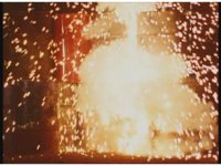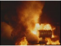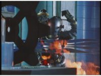 Ignited by the blasts, a fire rolls across the ground into an oil drum. Then it all goes kablooey around our heroes, and the monster. |