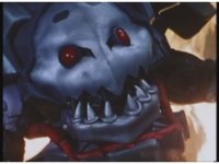 Real close on King Mondo's face, talking, rising up and down and motioning arm and staff out of frame while doing so. |