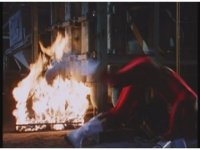 Cuts follow-ups of trio forcing monster's face into fire. |