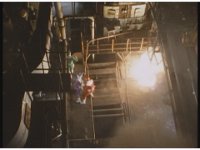 Downward shot as Rangers scramble off to our left as chunks of debris fall down into fiery room. |