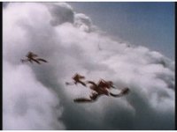Continued, the trio of Quadrafighters fly in formation through the sky, firing energy-ring beams to our right. |
