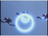A trio of Quadrafighters soar in tight formation, turning to our left while firing their beams of energy rings. |
