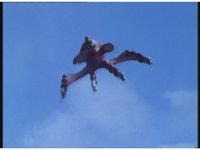Upward angle, pan up as Quadrafighters soars through the sky right above and over us. |