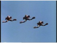 A trio of Quadrafighters fly in formation through the sky, turning to our right together. |