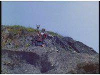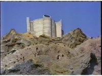 Pan right, as Klank walks up to cliff's edge, holding Orbus, talking and taking a bow. |