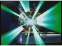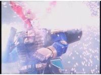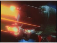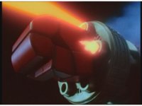 Close-up on Red Battlezord's right fist, still pistoning in and out while unleashing golden laser bolts from its gauntlet. |