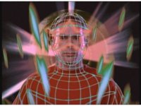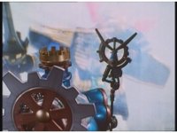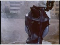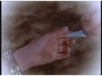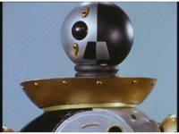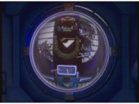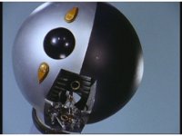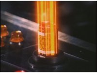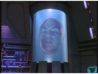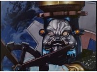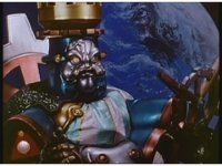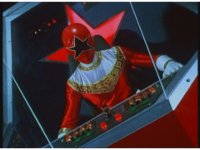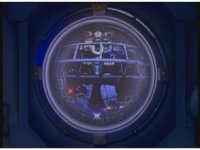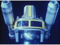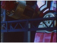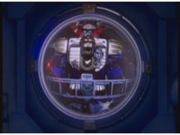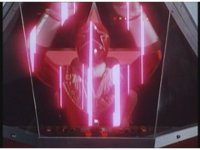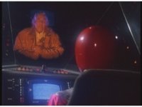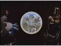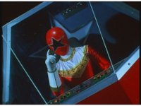 Reverse angle in Red Battlezord cockpit, Red watching as a transmission of Sam Trueheart talks to him in his front window, before fading away. |