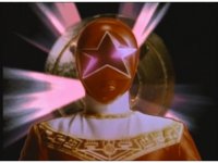 In Red Battlezord cockpit, Red glances around as golden light flashes off-frame. |