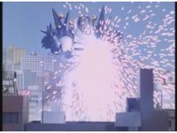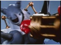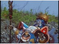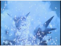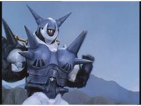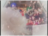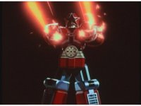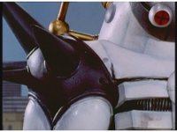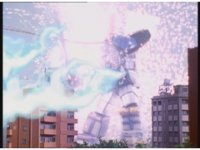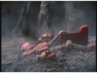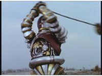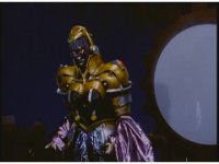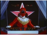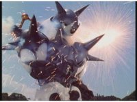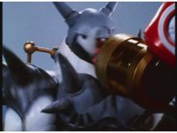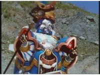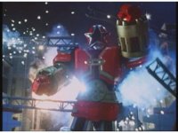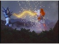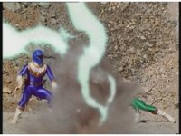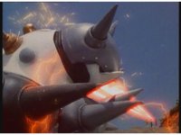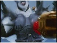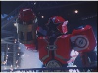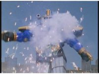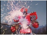 Close on Red Battlezord, lights flashing rapidly, causing it to go into a seizure, flailing arms about. |