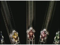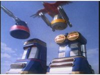 Track around to the left, as Zeozord Five passes over Zeozords One & Two, causing their Battle Helmets to slide forth off of their now-stationary forms. |