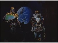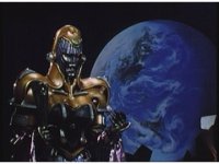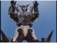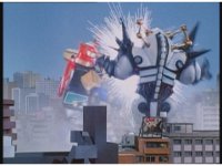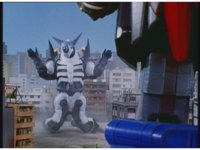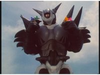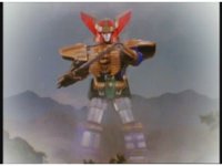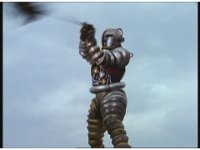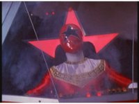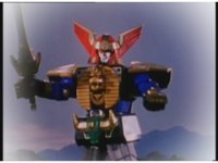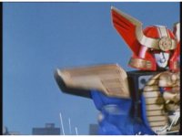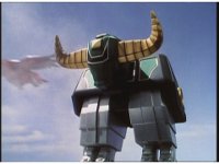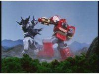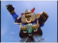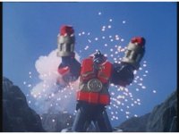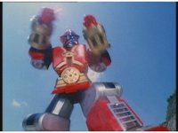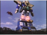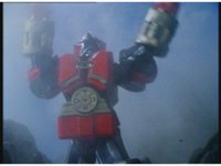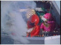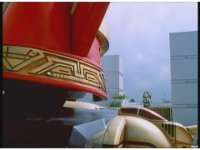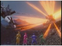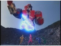 Zoom out, close on Red Battlezord, lowering arms victoriously. |