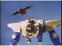 Track around left, as Zeozord Four slides its rear end into its front, legs together, forming the Megazord hips and thighs formation,just before Zeozord Five soars past above. |
