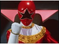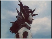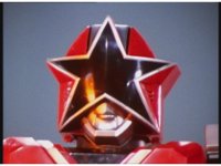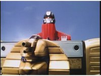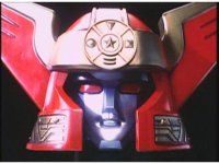 Close-up on Red Battlezord, lowering head and looking forth, calmly. |